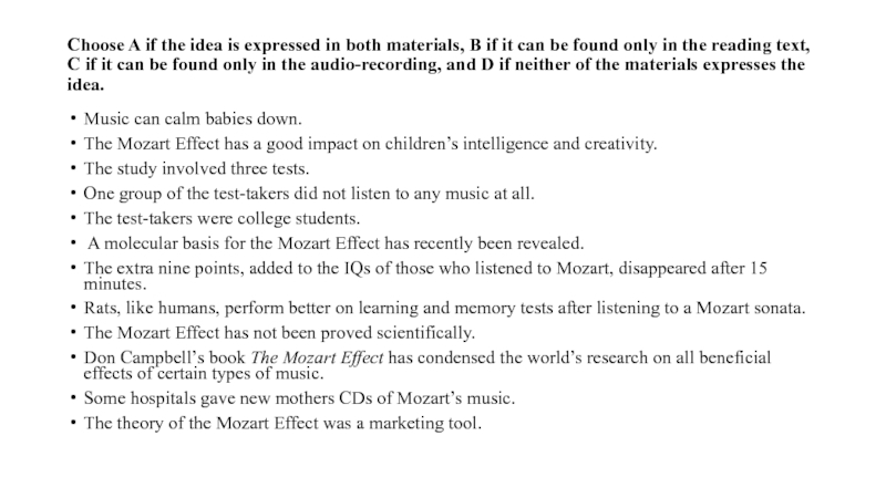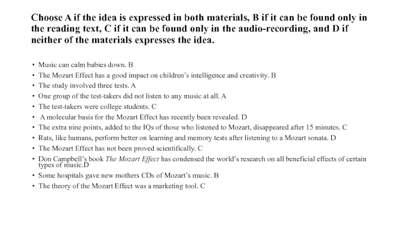 text, C if it can be found only in the audio-recording, and D if neither of the materials expresses the idea.