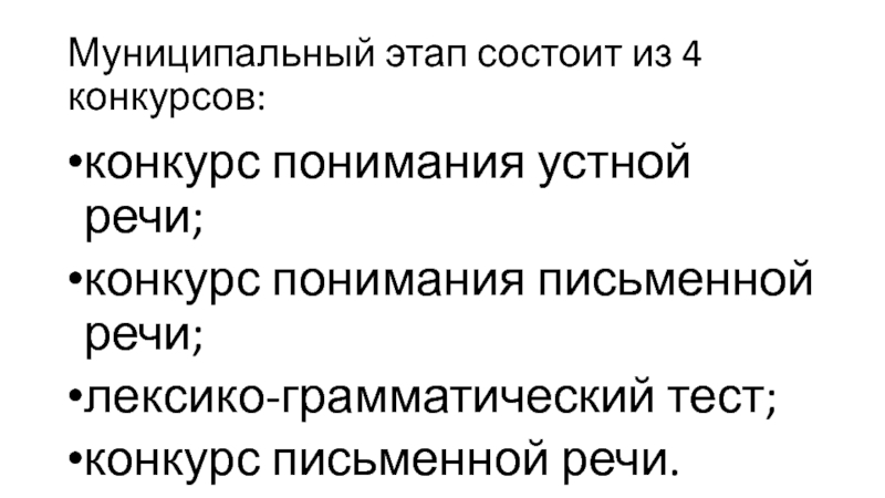 Слайд 4Муниципальный этап состоит из 4 конкурсов: