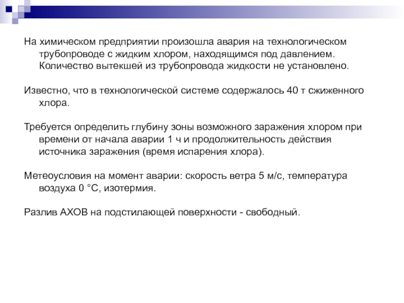 На химическом предприятии произошла авария на технологическом трубопроводе с жидким хлором, находящимся под давлением. Количество вытекшей из трубопровода жидкости не установлено.Известно, что в технологической системе содержалось 40 т сжиженного хлора.Требуется определить