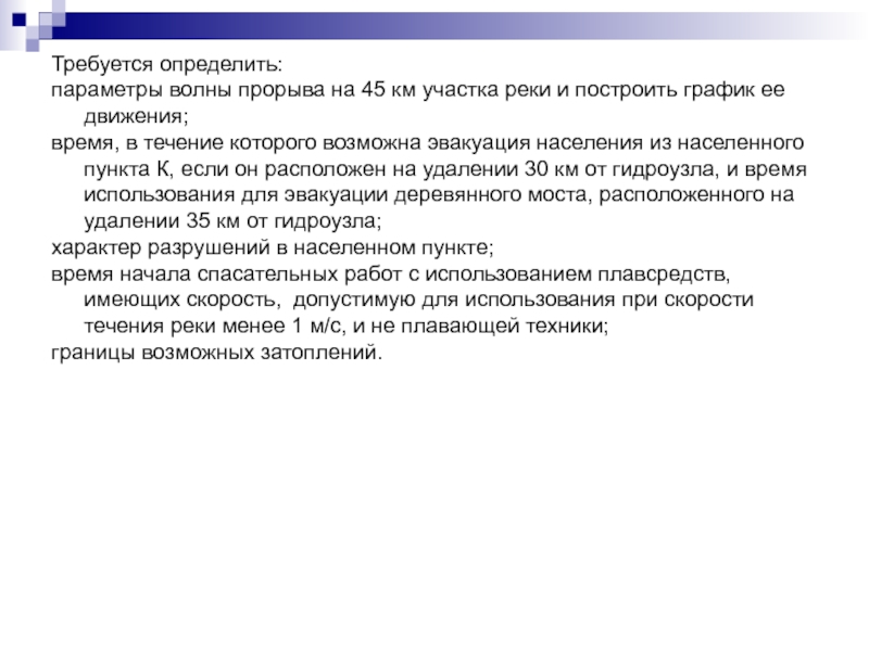 Требуется определить: параметры волны прорыва на 45 км участка реки и построить график ее движения; время, в