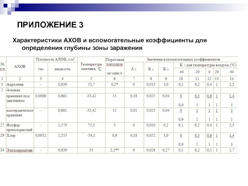 Характеристики АХОВ и вспомогательные коэффициенты для определения глубины зоны зараженияПРИЛОЖЕНИЕ 3