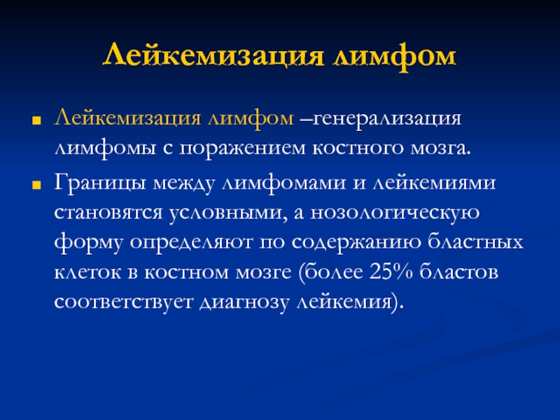 Лейкемизация лимфом –генерализация лимфомы с поражением костного мозга.