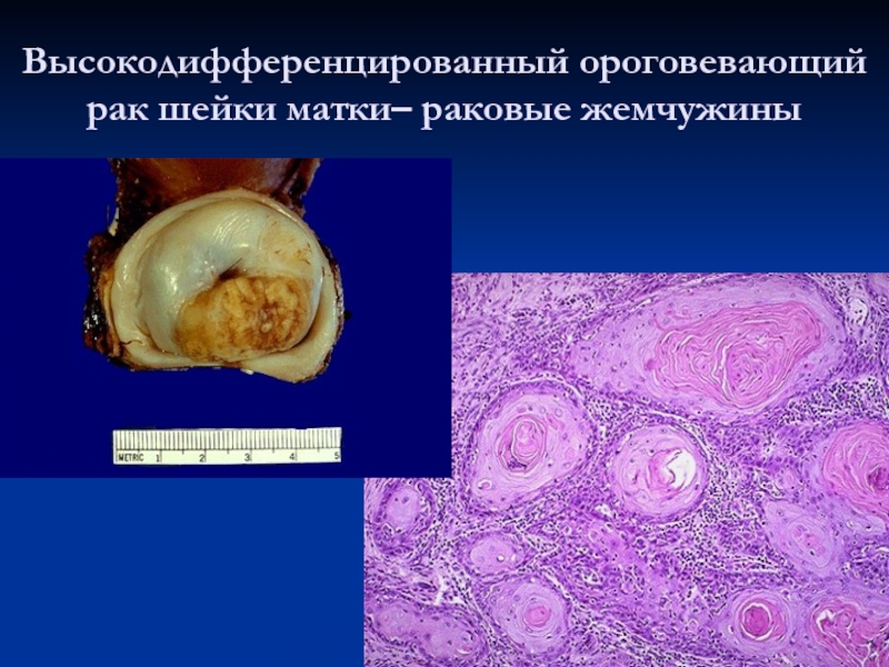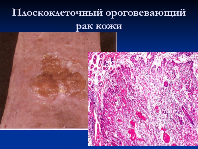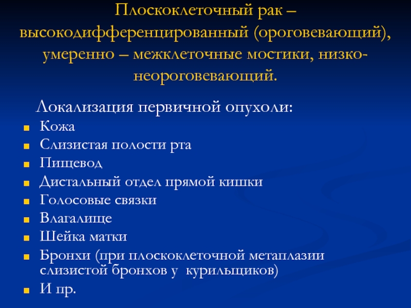 Слайд 19Плоскоклеточный рак – высокодифференцированный (ороговевающий), умеренно – межклеточные мостики, низко-
