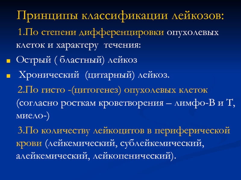 3.По количеству лейкоцитов в периферической крови (лейкемический, сублейкемический, алейкемический, лейкопенический).