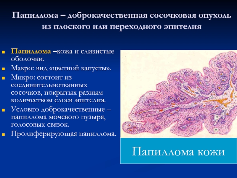 Слайд 18Папиллома – доброкачественная сосочковая опухоль из плоского или переходного эпителия