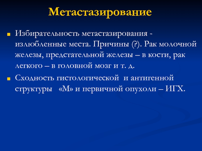 Избирательность метастазирования -излюбленные места. Причины (?). Рак молочной железы, предстательной