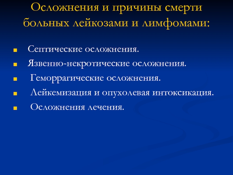 Слайд 85Осложнения и причины смерти больных лейкозами и лимфомами: