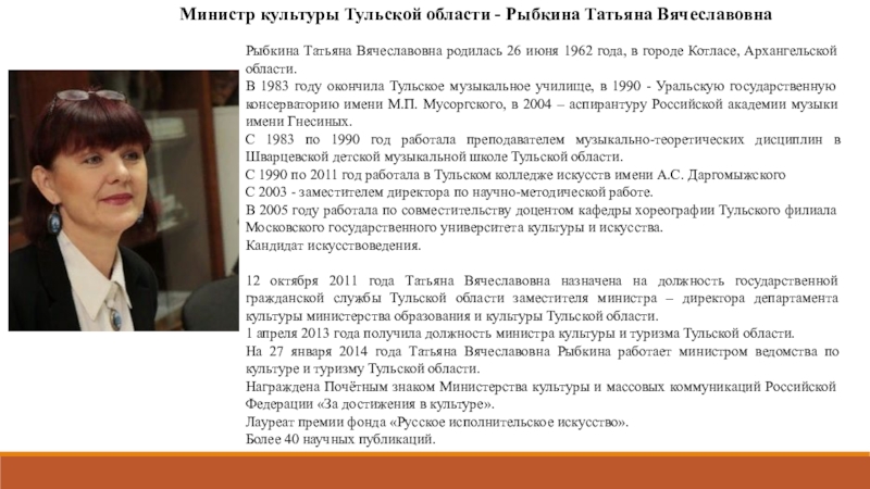 Министр культуры Тульской области - Рыбкина Татьяна Вячеславовна