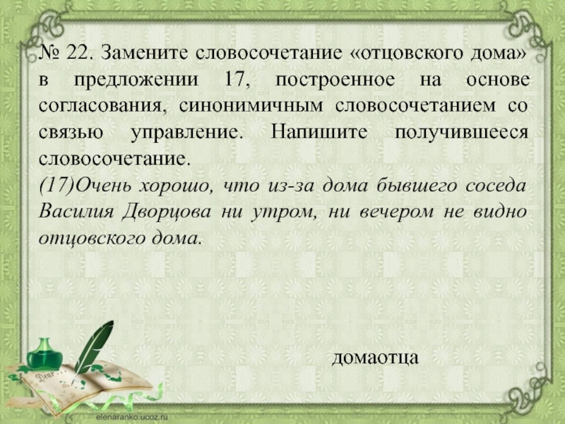 Слайд 32№ 22. Замените словосочетание «отцовского дома» в предложении 17, построенное