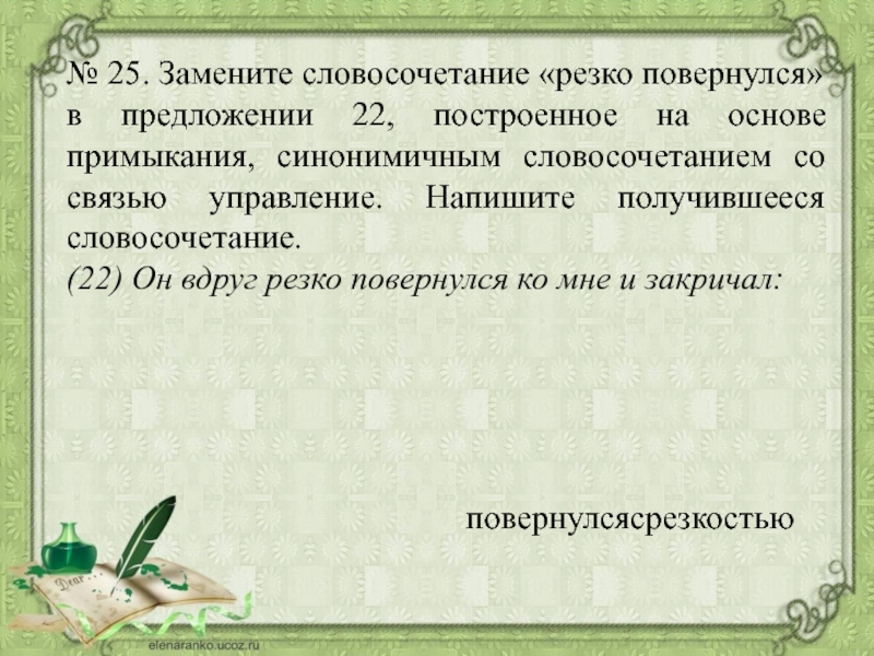 Слайд 35№ 25. Замените словосочетание «резко повернулся» в предложении 22, построенное