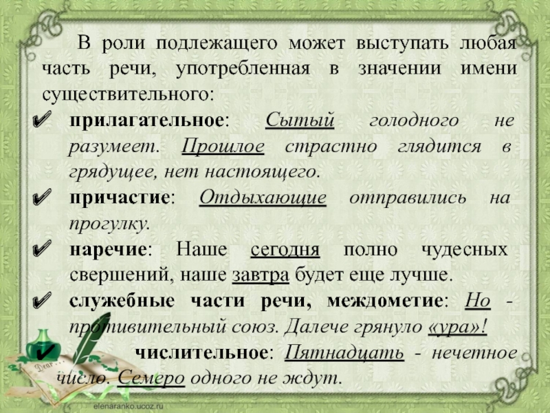 Слайд 5 В роли подлежащего может выступать любая часть речи, употребленная