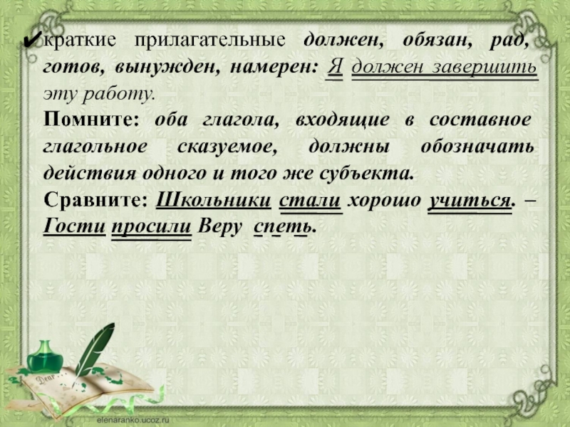 Слайд 13краткие прилагательные должен, обязан, рад, готов, вынужден, намерен: Я должен