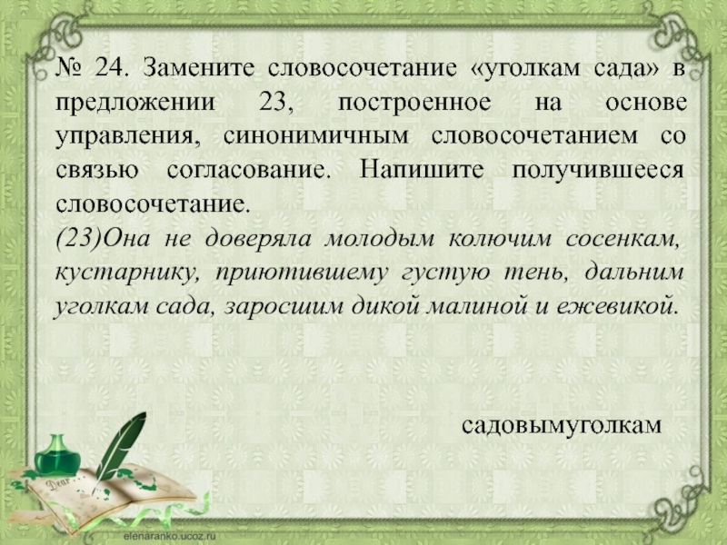 Слайд 34№ 24. Замените словосочетание «уголкам сада» в предложении 23, построенное