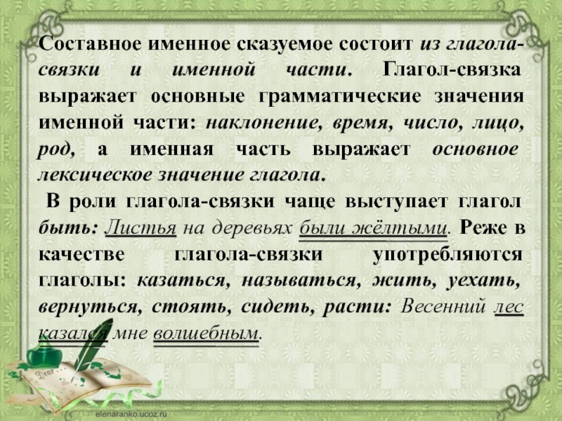 Слайд 14Составное именное сказуемое состоит из глагола-связки и именной части. Глагол-связка