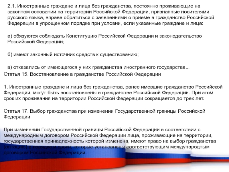 1. Иностранные граждане и лица без гражданства, ранее имевшие гражданство Российской Федерации, могут быть восстановлены в гражданстве Российской Федерации. При этом срок их проживания на территории Российской Федерации сокращается до трех лет.