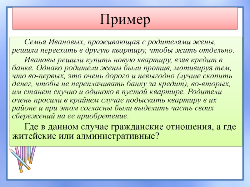 кредит в банке. Однако родители жены были против, мотивируя тем, что во-первых, это очень дорого и невыгодно (лучше скопить денег, чтобы не переплачивать банку за кредит), во-вторых, им станет скучно и одиноко в пустой квартире. Родители очень просили в крайнем случае подыскать квартиру в их районе и при этом согласны были выделить часть своих сбережений на ее приобретение.Где в данном случае гражданские отношения, а где житейские или административные?