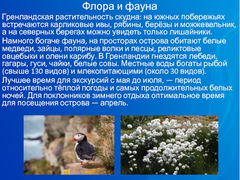 Намного богаче фауна, на просторах острова обитают белые медведи, зайцы, полярные волки и песцы, реликтовые овцебыки и олени карибу. В Гренландии гнездятся лебеди, гагары, гуси, чайки, белые совы. Местные воды богаты рыбой (свыше 130 видов) и млекопитающими (около 30 видов).
