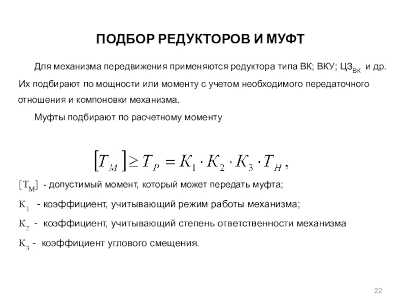 Слайд 22ПОДБОР РЕДУКТОРОВ И МУФТ