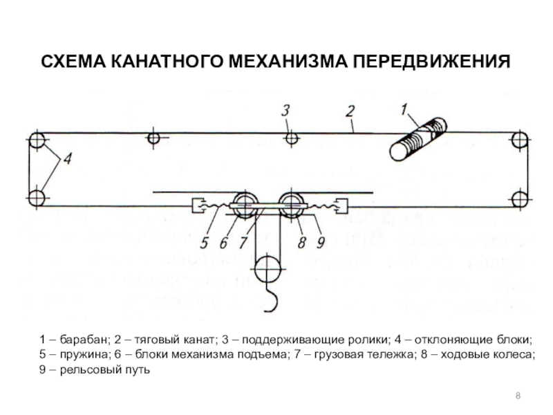 Слайд 8СХЕМА КАНАТНОГО МЕХАНИЗМА ПЕРЕДВИЖЕНИЯ