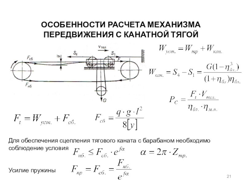 Слайд 21ОСОБЕННОСТИ РАСЧЕТА МЕХАНИЗМА ПЕРЕДВИЖЕНИЯ С КАНАТНОЙ ТЯГОЙ