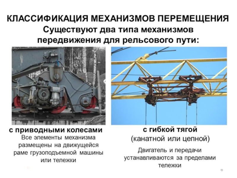 Различают механизмы передвижения безрельсового транспорта и механизмы передвижения по рельсовым путям.