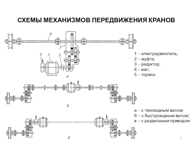 Слайд 7СХЕМЫ МЕХАНИЗМОВ ПЕРЕДВИЖЕНИЯ КРАНОВ