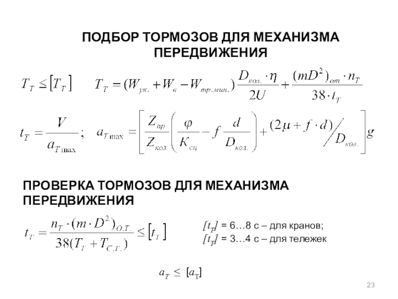 Слайд 23ПОДБОР ТОРМОЗОВ ДЛЯ МЕХАНИЗМА ПЕРЕДВИЖЕНИЯ