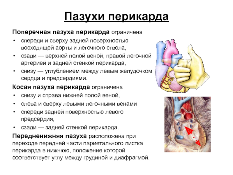 Передненижняя пазуха расположена при переходе передней части париетального листка перикарда в нижнюю, положение которой соответствует углу между грудиной и диафрагмой.