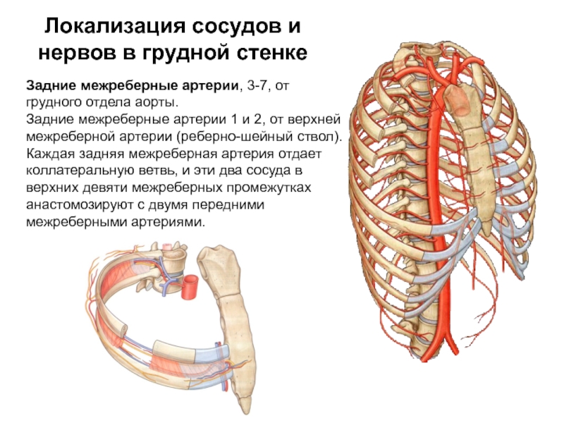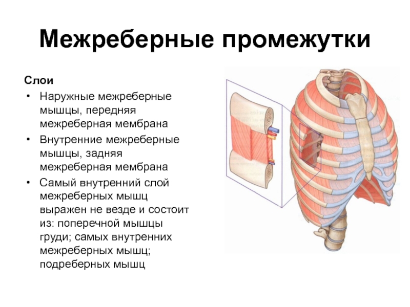 Строение стенок грудной клетки: грудина, ребра, межреберные промежутки. Локализация