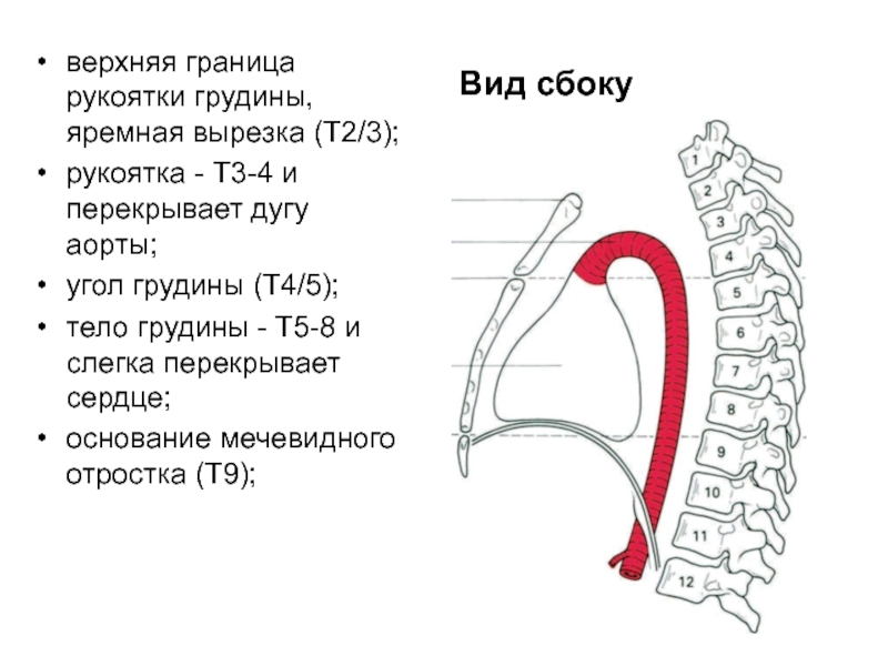 верхняя граница рукоятки грудины, яремная вырезка (T2/3);