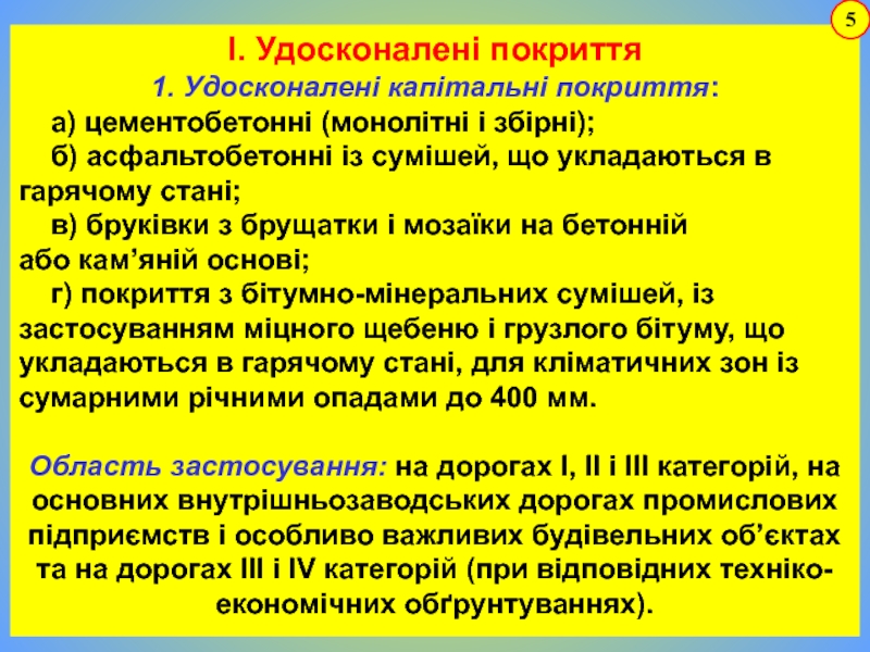 Область застосування: на дорогах IV і V категорій, а для будівництва дорожніх покрить у кілька черг також на дорогах III і IV категорій (для першої черги будівництва), на внутрішніх дорогах промислових підприємств і будівельних об’єктів, де по санітарних умовах і умовам руху немає необхідності в застосуванні покрить удосконалених видів.