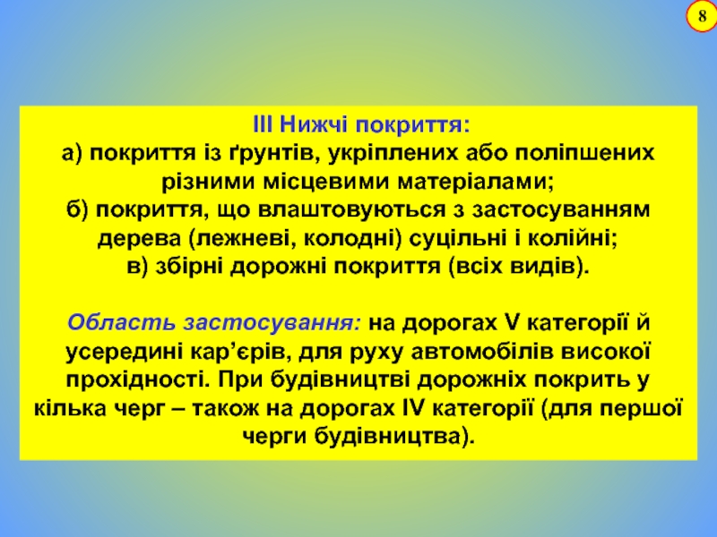 б) покриття з ґрунтів і місцевих маломіцних кам’яних матеріалів оброблених органічними і неорганічними в’язкими компонентами;