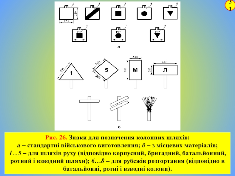 Вказівні знаки мають різну форму і вид. Вони служать для позначення напрямку руху і належності колонного шляху частині (підрозділу). Варіанти знаків військового виготовлення представлені на рис. 16 (номер шляху пишуть посередині знака).