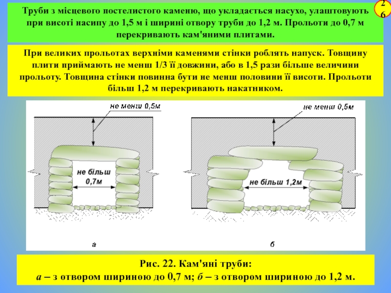 При великих прольотах верхніми каменями стінки роблять напуск. Товщину плити приймають не менш 1/3 її довжини, або в 1,5 рази більше величини прольоту. Товщина стінки повинна бути не менш половини її висоти. Прольоти більш 1,2 м перекривають накатником.