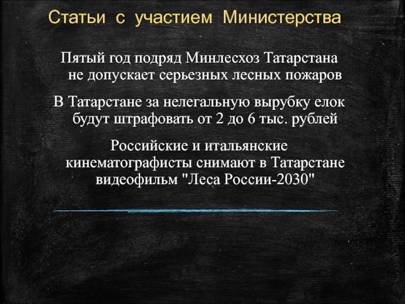Статьи с участием МинистерстваПятый год подряд Минлесхоз Татарстана не допускает серьезных лесных пожаровВ Татарстане за нелегальную вырубку