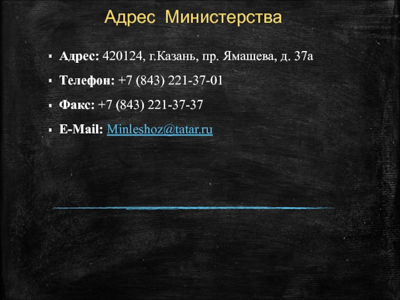 Адрес Министерства Адрес: 420124, г.Казань, пр. Ямашева, д. 37аТелефон: +7 (843) 221-37-01Факс: +7 (843) 221-37-37E-Mail: Minleshoz@tatar.ru