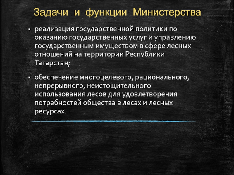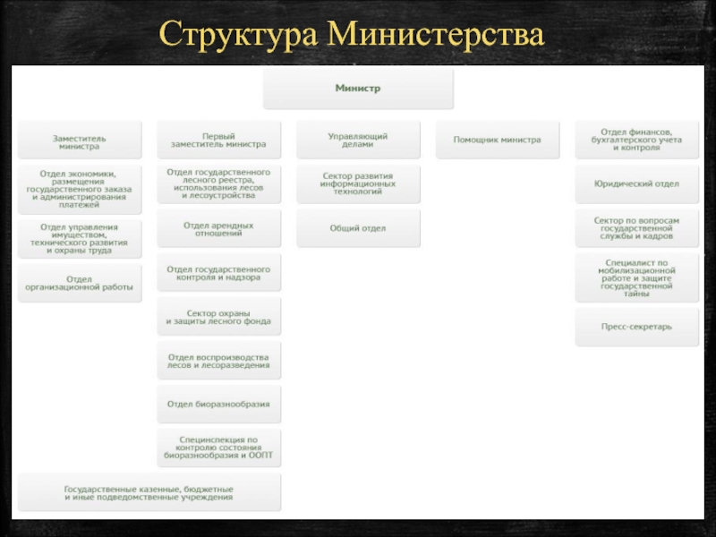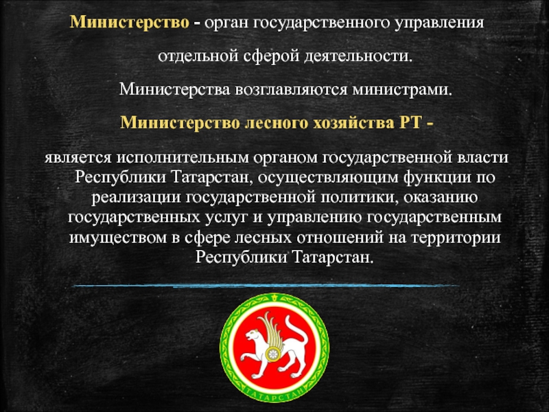 Министерство - орган государственного управления   отдельной сферой деятельности.   Министерства возглавляются министрами.Министерство лесного хозяйства РТ - является исполнительным органом