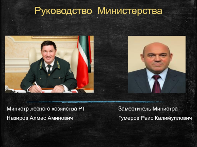 Руководство МинистерстваМинистр лесного хозяйства РТНазиров Алмас АминовичЗаместитель Министра Гумеров Раис Калимуллович