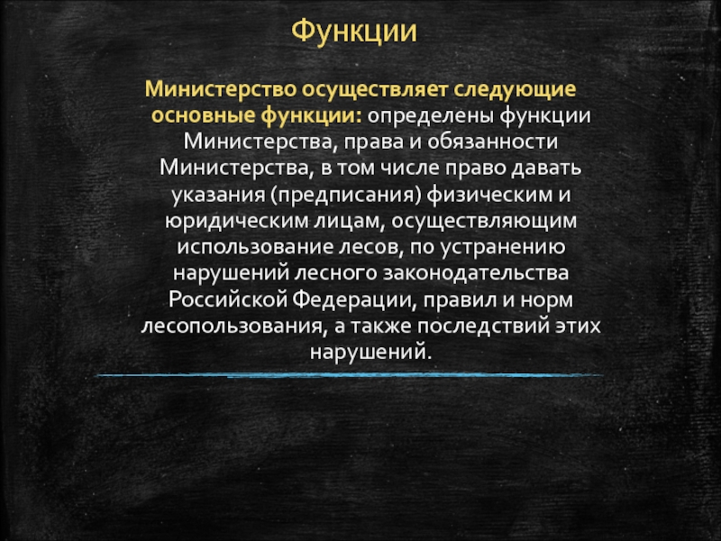 ФункцииМинистерство осуществляет следующие основные функции: определены функции Министерства, права и обязанности Министерства, в том числе право давать указания
