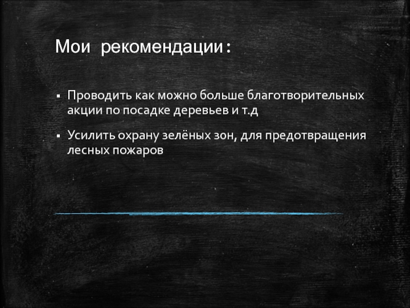 Мои рекомендации:Проводить как можно больше благотворительных акции по посадке деревьев и т.дУсилить охрану зелёных зон, для предотвращения