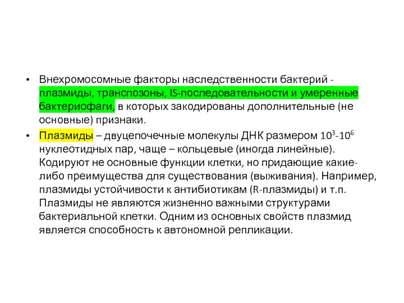 Слайд 17Внехромосомные факторы наследственности бактерий - плазмиды, транспозоны, IS-последовательности и умеренные