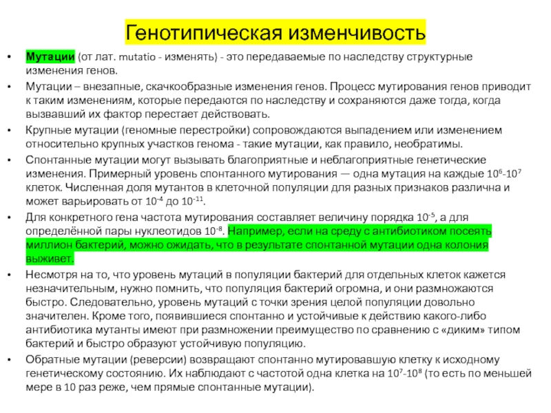 Спонтанные мутации могут вызывать благоприятные и неблагоприятные генетические изменения. Примерный уровень спонтанного мутирования — одна мутация на каждые 106-107 клеток. Численная доля мутантов в клеточной популяции для разных признаков различна и может варьировать от 10-4 до 10-11.