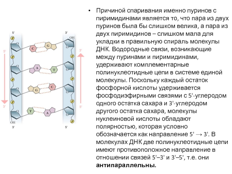 двух пиримидинов – слишком мала для укладки в правильную спираль молекулы ДНК. Водородные связи, возникающие между пуринами и пиримидинами, удерживают комплементарные полинуклеотидные цепи в системе единой молекулы. Поскольку каждый остаток фосфорной кислоты удерживается фосфодиэфирными связями с 5'-углеродом одного остатка сахара и 3'-углеродом другого остатка сахара, молекулы нуклеиновой кислоты обладают полярностью, которая условно обозначается как направление 5' → 3'. В молекулах ДНК две полинуклеотидные цепи имеют противоположное направление в отношении связей 5'–3' и 3'–5', т.е. они антипараллельны.
