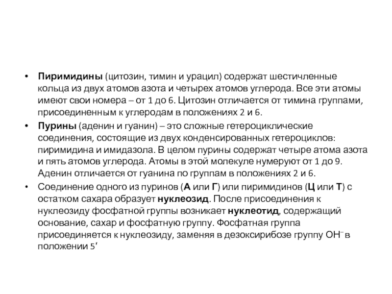 Слайд 7Пиримидины (цитозин, тимин и урацил) содержат шестичленные кольца из двух