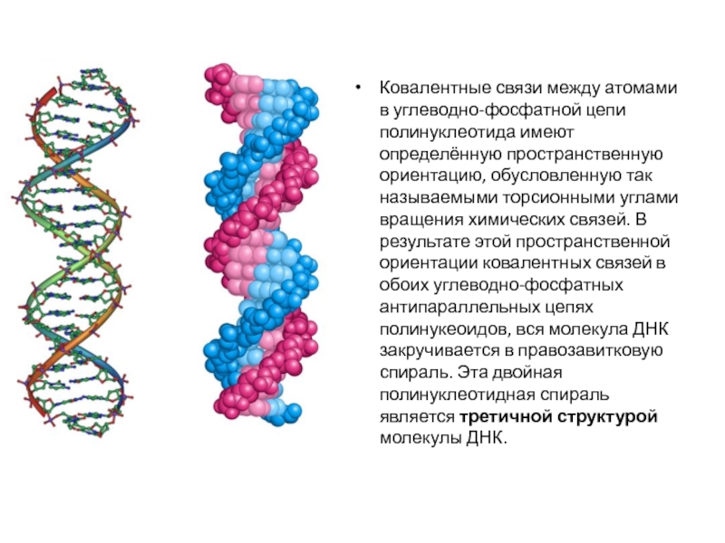 В результате этой пространственной ориентации ковалентных связей в обоих углеводно-фосфатных антипараллельных цепях полинукеоидов, вся молекула ДНК закручивается в правозавитковую спираль. Эта двойная полинуклеотидная спираль является третичной структурой молекулы ДНК.