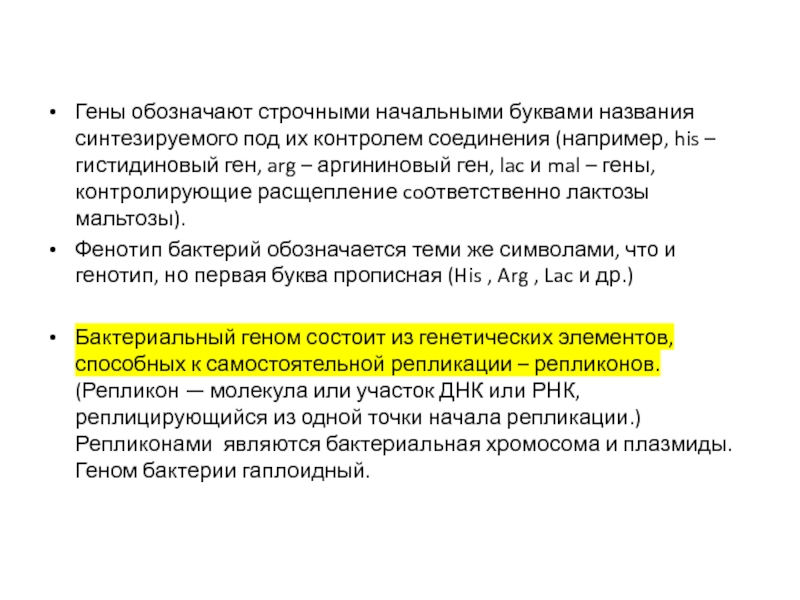 Фенотип бактерий обозначается теми же символами, что и генотип, но первая буква прописная (His , Arg , Lac и др.)