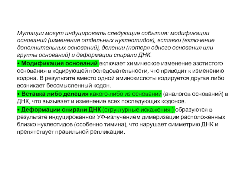 Слайд 23Мутации могут индуцировать следующие события: модификации оснований (изменения отдельных нуклеотидов),
