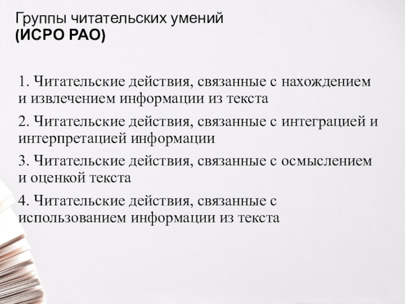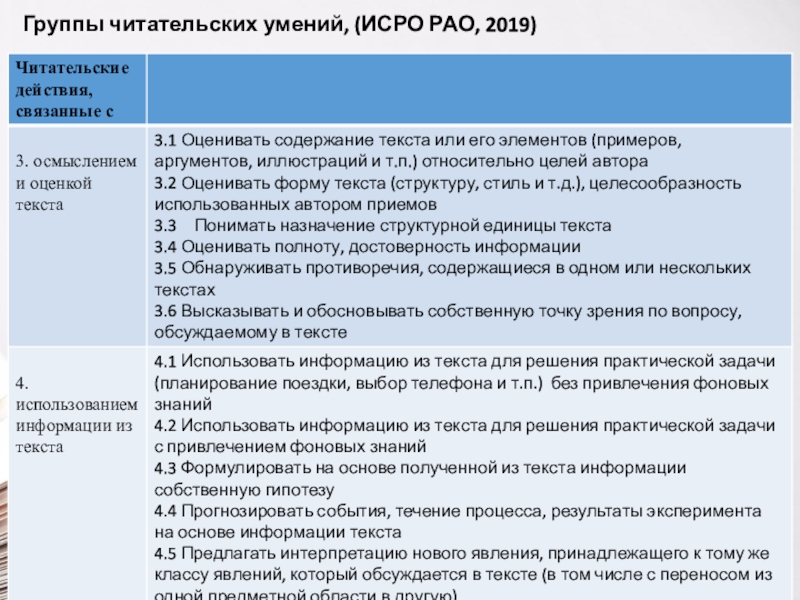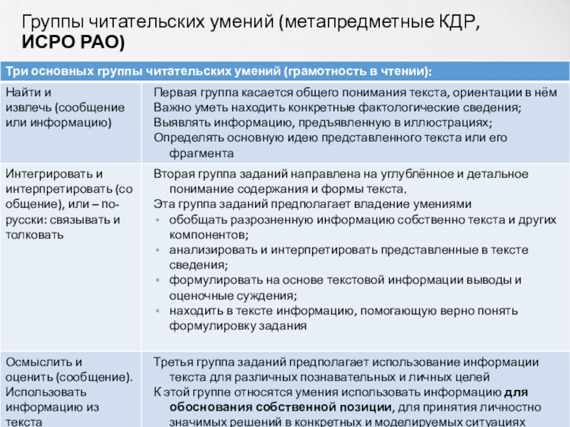 Слайд 7Группы читательских умений (метапредметные КДР, ИСРО РАО)