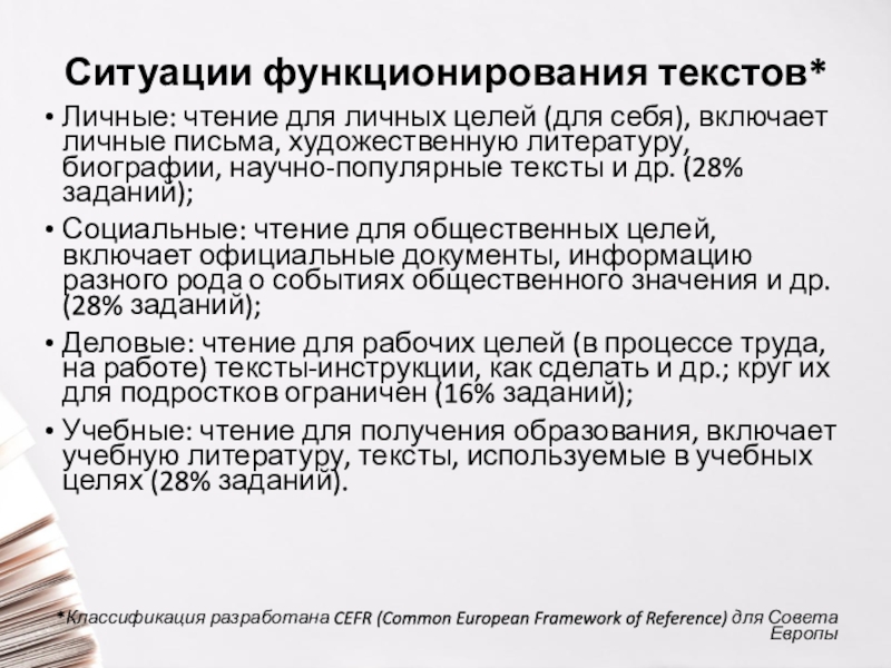 Учебные: чтение для получения образования, включает учебную литературу, тексты, используемые в учебных целях (28% заданий).