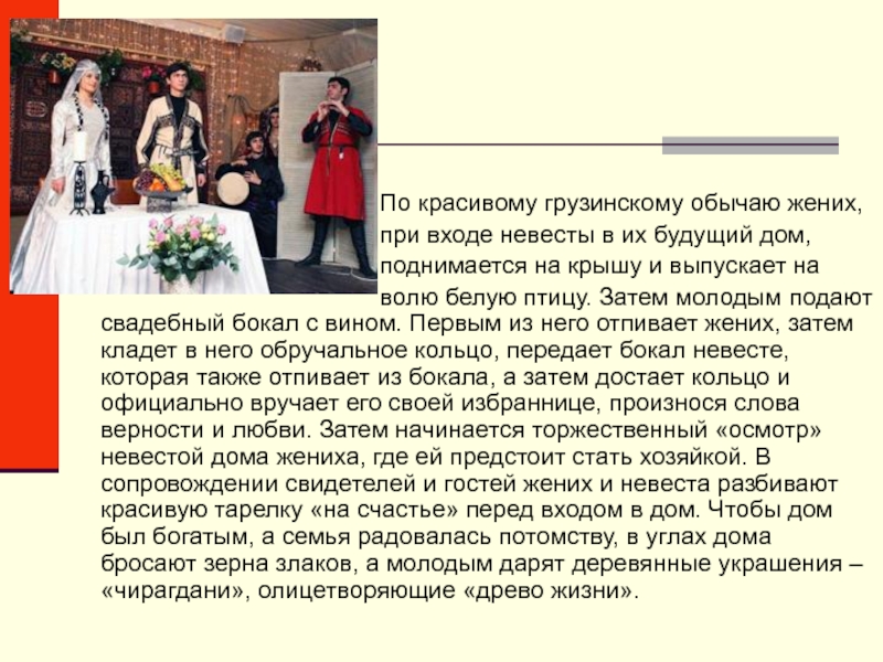 волю белую птицу. Затем молодым подают свадебный бокал с вином. Первым из него отпивает жених, затем кладет в него обручальное кольцо, передает бокал невесте, которая также отпивает из бокала, а затем достает кольцо и официально вручает его своей избраннице, произнося слова верности и любви. Затем начинается торжественный «осмотр» невестой дома жениха, где ей предстоит стать хозяйкой. В сопровождении свидетелей и гостей жених и невеста разбивают красивую тарелку «на счастье» перед входом в дом. Чтобы дом был богатым, а семья радовалась потомству, в углах дома бросают зерна злаков, а молодым дарят деревянные украшения – «чирагдани», олицетворяющие «древо жизни».